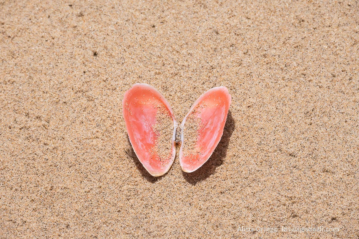 Entonces me fijé en que había muchas conchas con una capa también rosa ¿Sería eso mismo, que cuando se deshacen tiñen la arena? Es una teoría como otra cualquiera, que conste, pero fantaseé con que puede ser el mismo principio de las conchas de múrex que los fenicios utilizaban para conseguir el codiciado tinte púrpura de la Antigüedad.