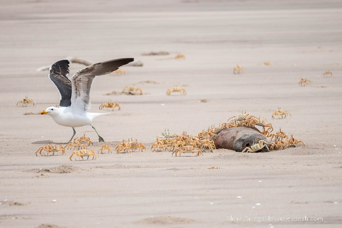 Un poco más adelante vimos un montón de cangrejos grandes reunidos en torno a algo que aún no distinguíamos bien. Además de los cangrejos, había una gaviota que también picoteaba.