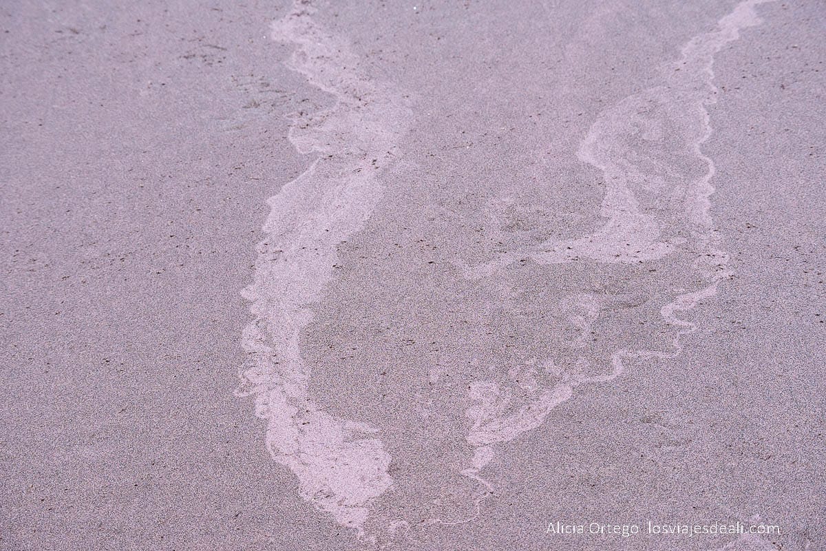 La arena, sobre todo en las orillas, tenía una capa de color rosa un poco rara. Parecía que alguien hubiese tirado un bote de pintura, pero su textura era similar a la de la arena más oscura que había debajo. Curiosamente no vimos, ni antes ni después, algo así en la orilla continental.
