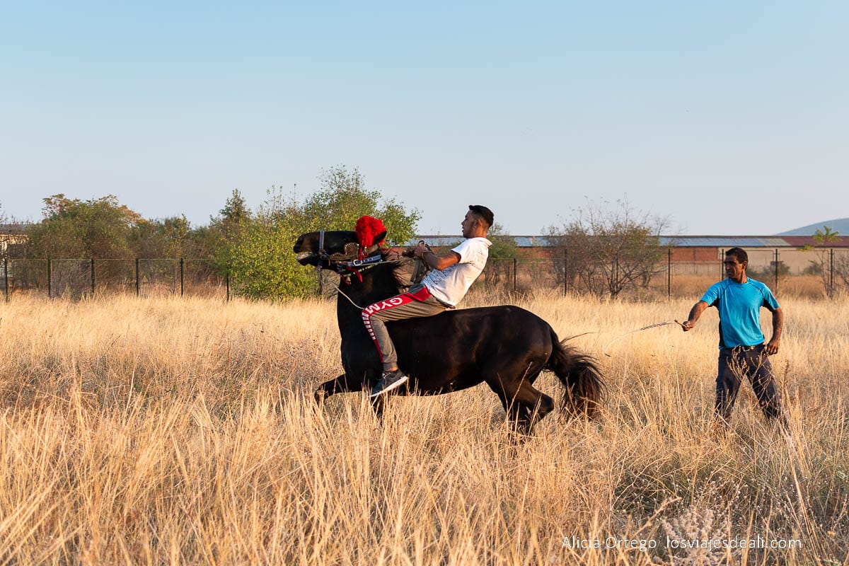 Un día salimos a un campito que hay cerca de la mahala. Nos van a hacer una demostración de la doma de caballos, uno de los oficios tradicionales que se están perdiendo. Nos muestran sus habilidades mientras cae el sol, y a la vuelta me subo con Kim a la taliga que lleva este mismo caballo.