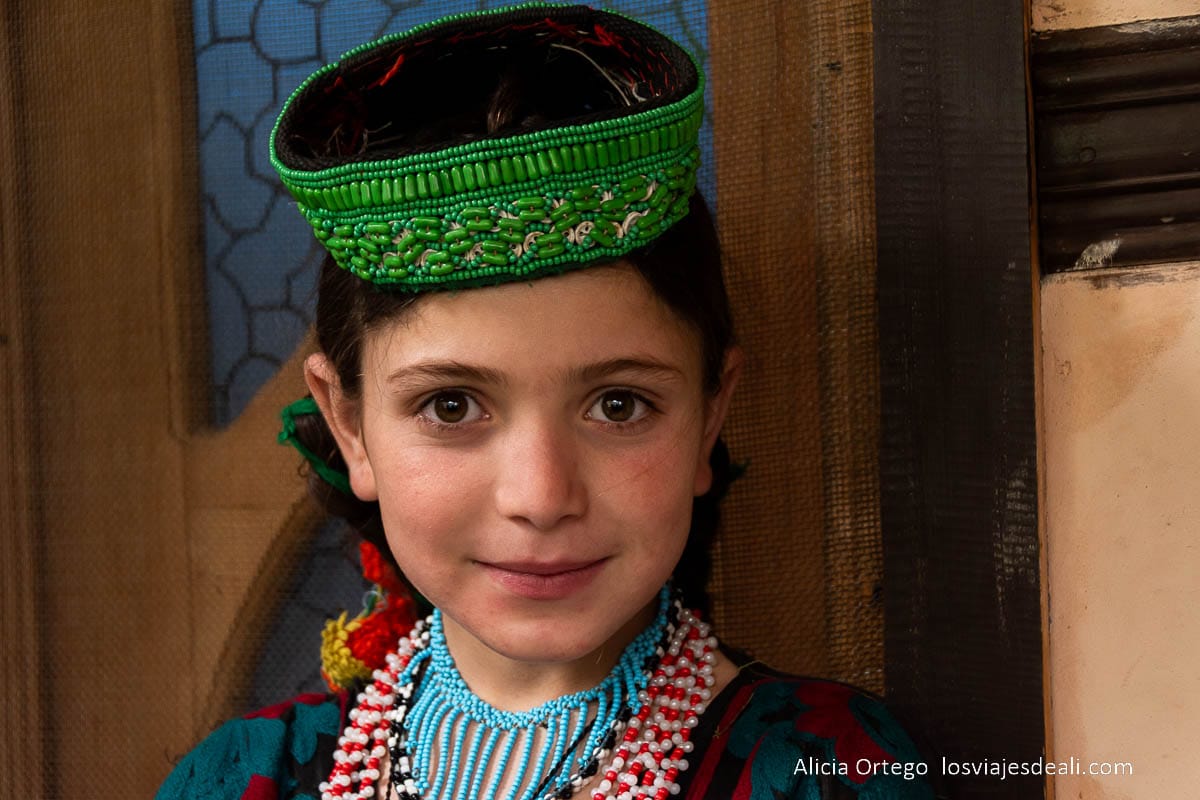 Cuando empezamos a cruzarnos con las mujeres kalash todo cambia. Es impresionante. Casi todas van vestidas con sus vestidos negros pero adornados con bordados de colores, botones y conchas de cauri. Se peinan el pelo con largas trenzas y llevan una especie de corona con una pieza rectangular que cubre la parte posterior de la cabeza y la nuca. Está hecha con bolitas de colores y preciosos diseños florales o geométricos. Algunas, además, tienen pequeños tatuajes en el rostro y las manos.