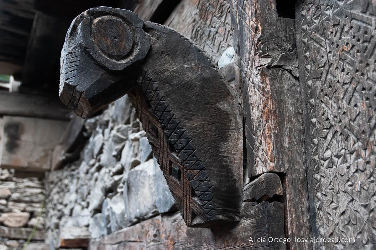 La mayoría de las casas son tradicionales. Están construidas en piedra, ensambladas con vigas de madera, son de dos pisos y están dispuestas trepando en la ladera de las montañas. Además tienen grandes balcones a los que se asoman sus habitantes. Hay veces en que te acuerdas del tebeo 13 Rue del Percebe.
