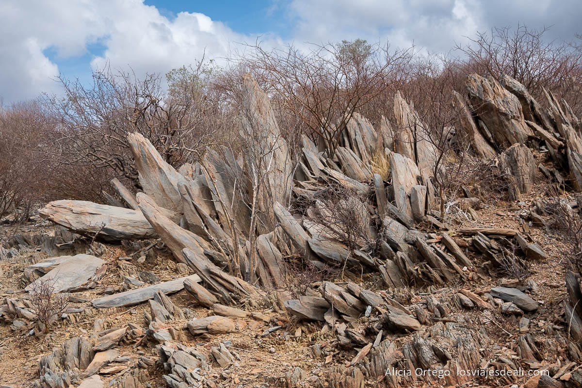 Ahora circulamos por pistas rocosas y entre pequeñas colinas que parecen haber sido machacadas por un martillo gigantesco. El suelo, en algunas zonas, es de rocas puntiagudas que parecen haber sido dispuestas en “milhojas”.