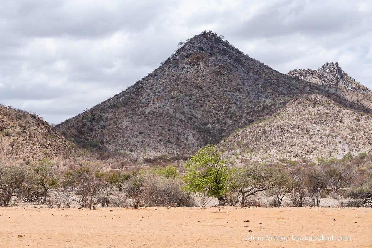 También unos arbustos que parecen mini acacias de diseño. Sus ramas son de un color rojo intenso que, al estar desnudas de hojas, recuerdan a los corales marinos. Se trata, probablemente, de especies de Commiphora, plantas maestras de la supervivencia que tiñen de color el suelo pedregoso de la meseta. Cuanto más estrés hídrico sufren, más rojas son sus ramas.