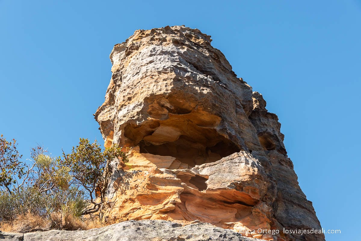 A diferencia de los Tsingy de Bemaraha, donde la roca caliza crea agujas afiladas como cuchillos, en Isalo la arenisca ha dado lugar a formas más redondeadas, más suaves en apariencia, aunque no por ello menos imponentes.