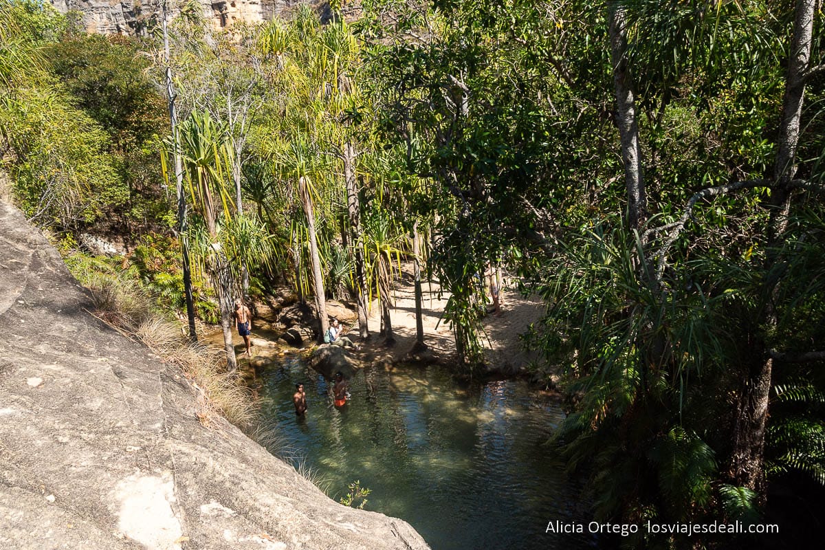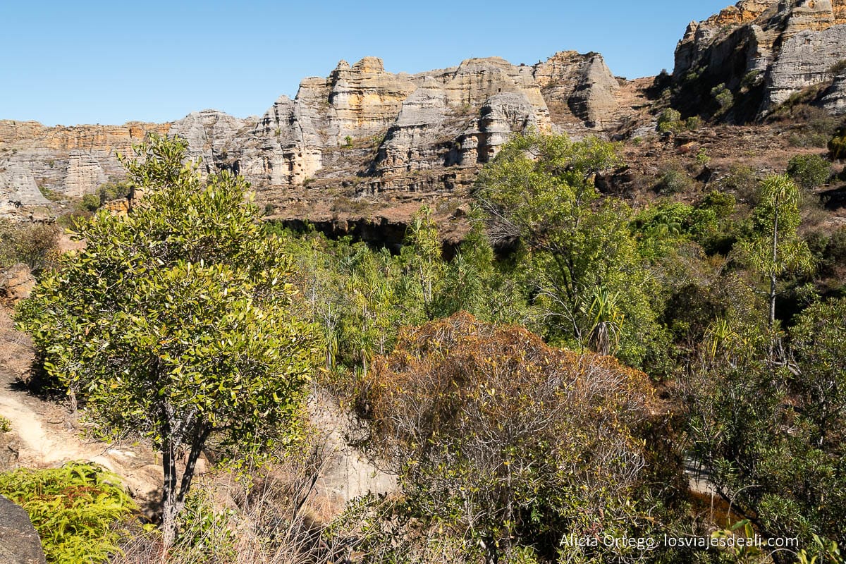 De golpe, las paredes de roca cálida ceden el paso a un bosque tropical húmedo. Hay palmeras y otras especies de árboles, vegetación de ribera, y las paredes del cañón parecen jardines colgantes revestidas de musgo y helechos. Uno de esos cambios de paisaje que hacen que Isalo sea tan especial.