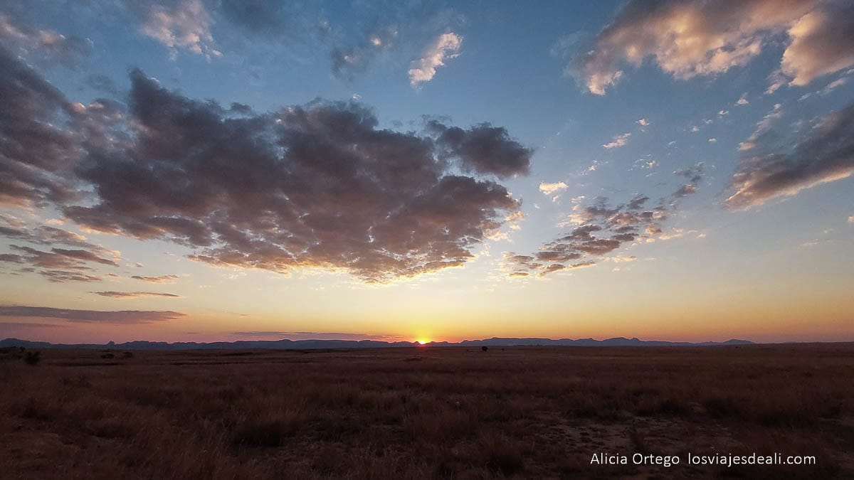 Cuando te vas acercando, nada hace adivinar lo que contiene. Parece que estás en una sabana africana, con horizontes despejados, hierbas altas y una cadena montañosa al fondo, el macizo de Isalo.