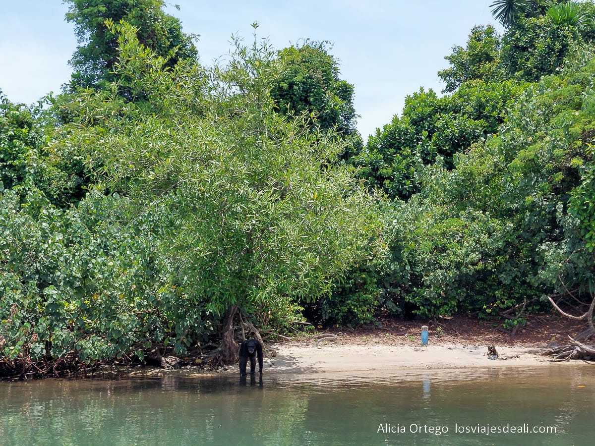 Al acercarnos a la isla, vimos a dos chimpancés de la docena que vivían en la isla en ese momento, siempre desde la distancia y sin bajarnos de la barca.