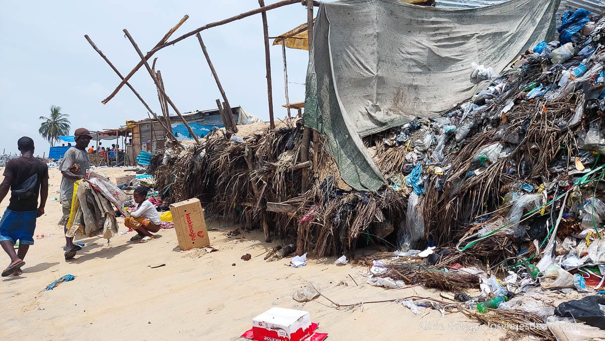 Sobre la arena, a medio metro del agua, hay grandes montones de basura más reciente. Mezcla de plásticos y muchos otros desechos. Tampoco es raro ver a la gente haciendo sus necesidades ahí mismo. Las condiciones son terribles.