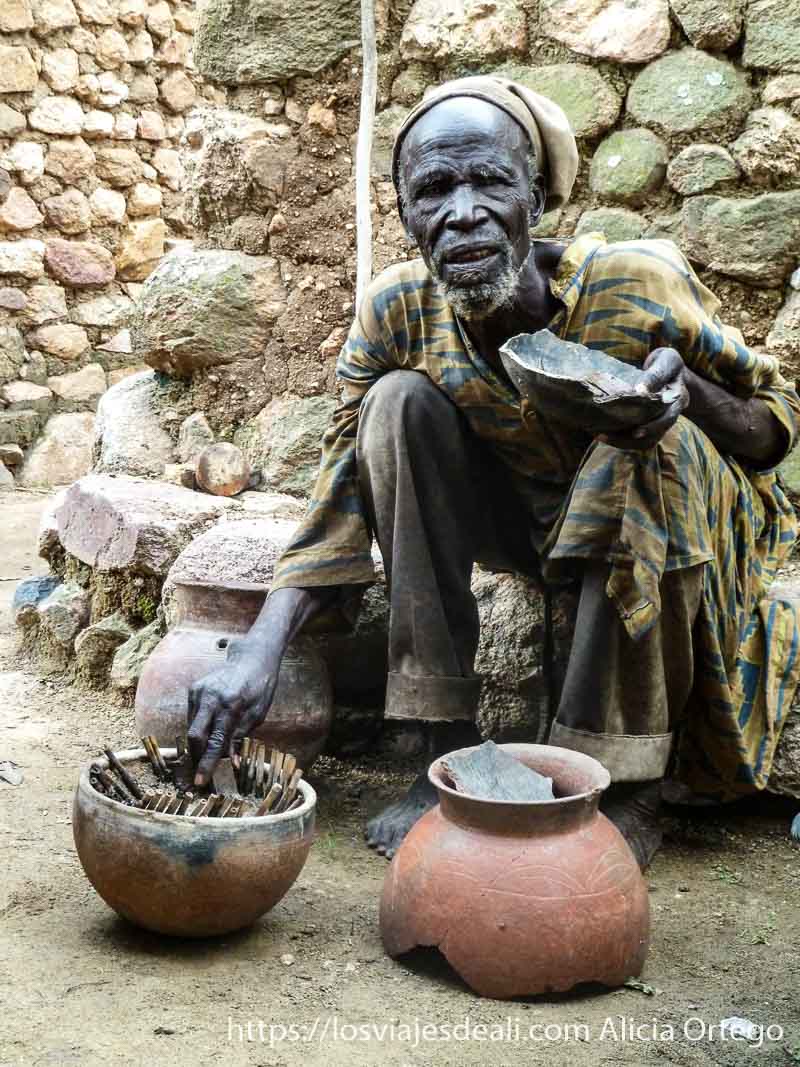 Después de saludarle, nos sentamos frente a él y comienza el ritual. A sus pies tiene una vasija de cerámica llena de arena húmeda. En ella empieza a clavar palitos y trocitos de cerámica en vertical, alrededor del borde. De forma meticulosa.